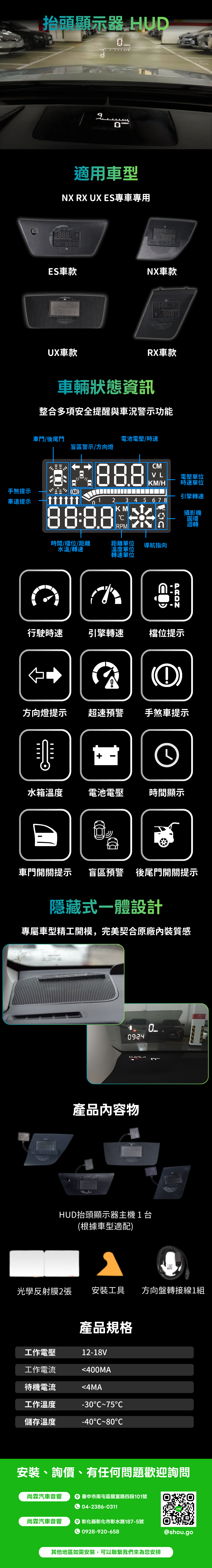 【不含安裝費】安裝費用視車型而定 專為 Lexus 車型打造的一體式 HUD 抬頭顯示器,關鍵行車資訊抬頭即見,安全提醒與車況監控同步呈現。 ✅專車專用,一體式設計、無損安裝、完美融入原車內裝 ✅行車資訊抬頭顯示:行駛時速、引擎轉速、檔位、方向燈、時間即時呈現 ✅安全提醒更完整:超速預警、車門/尾門開啟、手煞車提示一目了然 ✅車況監控更安心:水箱溫度、電瓶電壓即時監控,降低異常風險 ✅視線無需離開前方道路,提升駕駛專注度與行車安全
