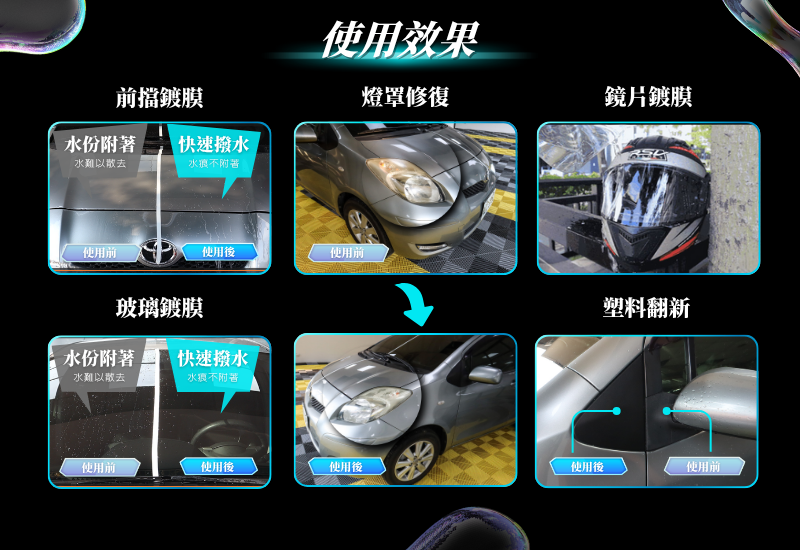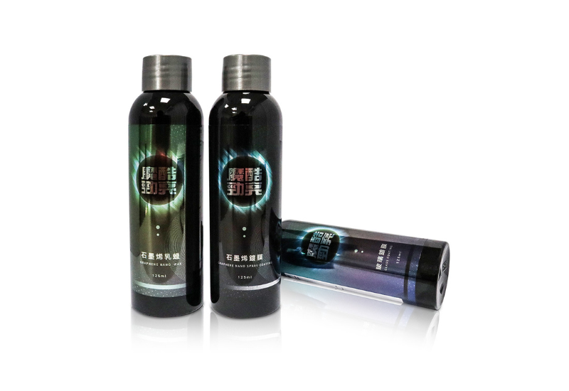 •石墨烯全方位鍍膜液: 具有極佳的亮澤度及保護,適用各種漆面,不分顏色,鍍鉻層及玻璃表面,獨特的防汙性。 •石墨烯乳蠟: 採用頂級抗菌石墨烯結合矽 、 氟聚合物 , 高抗UV 、 高防水 、 抗汙垢 , 保護你的愛車烤漆層 , 光滑亮澤 ,適用各種車色即未上鍍膜漆面 , 特定材質 , 包含漆面 , 鍍鉻層及車外玻璃。 •超效玻璃鍍膜劑: 使用特殊氟素成分及配方 , 結合清潔玻璃 , 加強潑水功能。
