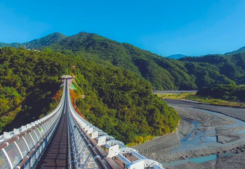 山川琉璃吊橋位於屏東縣三地門鄉,是全台最長的懸索吊橋,全長近 300 公尺,橫跨隘寮溪。吊橋最特別的是橋身鋪設了藍色琉璃片,在陽光照射下閃耀晶瑩光芒,宛如一條懸浮在天空的藍絲帶。 走在吊橋上,可以俯瞰溪谷與山巒,遠方綠意盎然,溪流蜿蜒而下,景致壯麗。微風吹拂,吊橋輕輕搖晃,讓人既緊張又興奮,是拍照與體驗刺激的最佳場景。黃昏時分,夕陽映照在吊橋與溪谷上,景色更是浪漫唯美。 這裡也是原住民文化的重要據點。周邊有許多排灣族與魯凱族的部落聚落,可以欣賞原民工藝與體驗傳統文化。餐飲部分推薦品嚐「原住民風味餐」,像是烤山豬肉、竹筒飯、石板烤肉,搭配小米酒,風味十足。