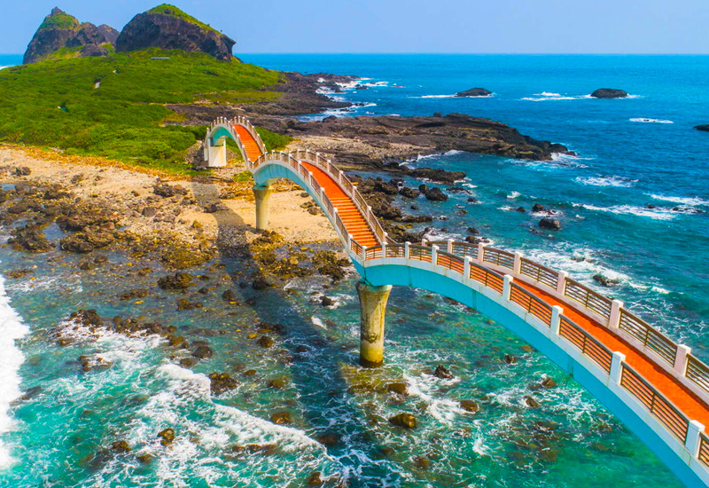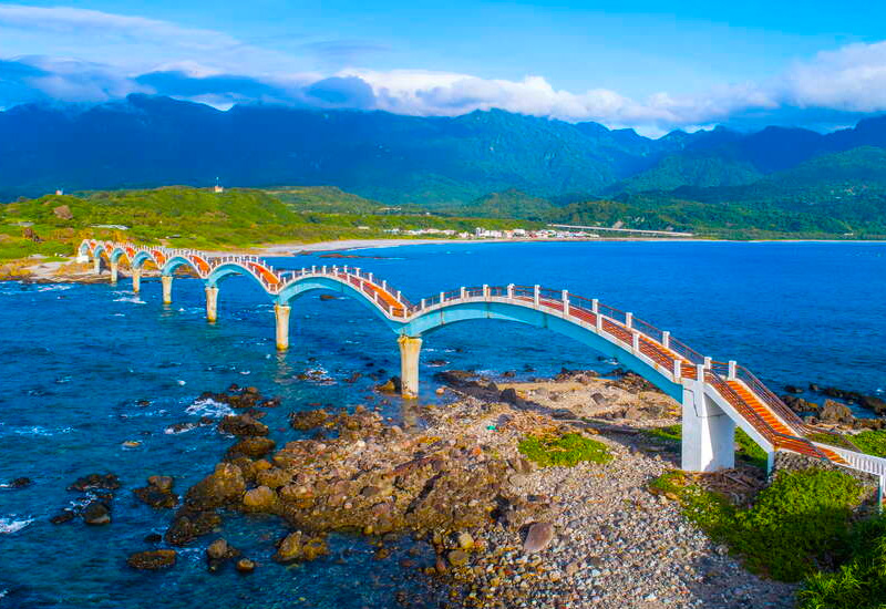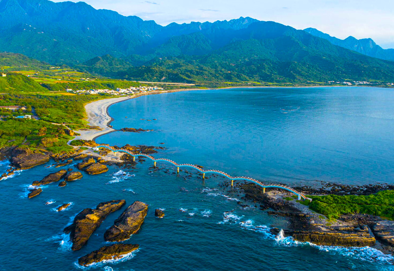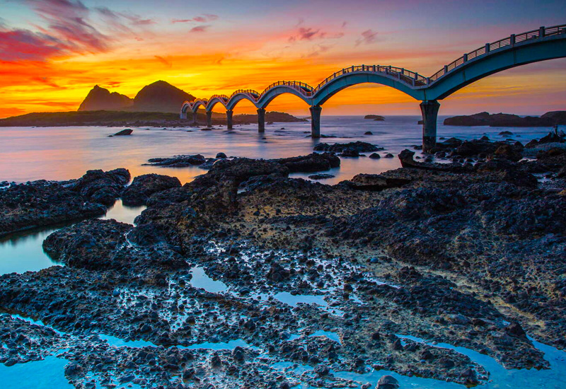 三仙台由離岸小島和珊瑚礁海岸構成,島上奇岩怪石林立,相傳呂洞賓、李鐵拐、何仙姑曾在此登陸。連接本島與小島的八拱跨海步橋,宛如一條巨龍伏臥在海上,是台東東海岸最著名的地標。海天一線。你可以沿著八拱跨海步橋,走到三仙台島,欣賞獨特的海蝕地形。這裡的景色獨一無二,是個絕佳的拍照打卡點。 您可以在此欣賞壯闊的海蝕地形,或在清晨迎接台灣本島的第一道曙光。