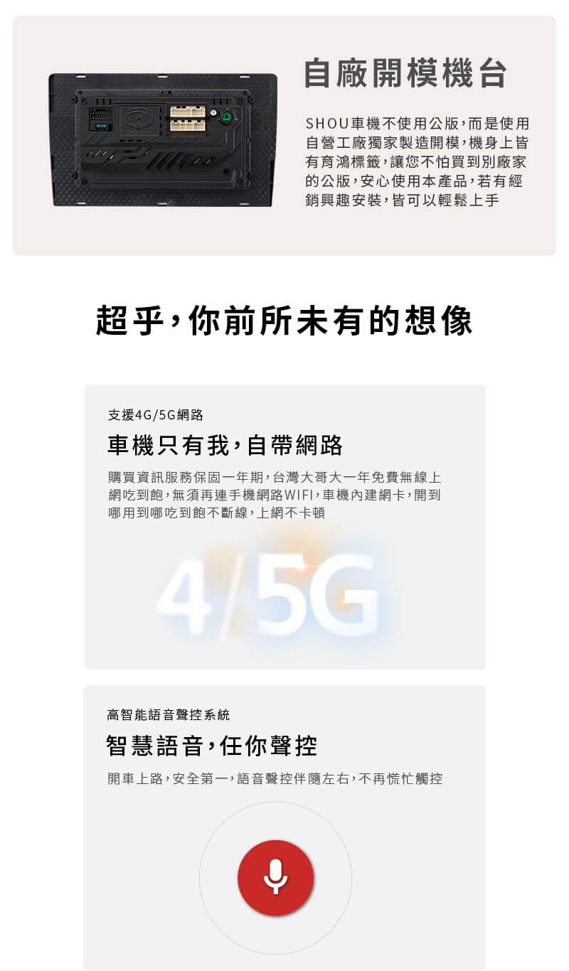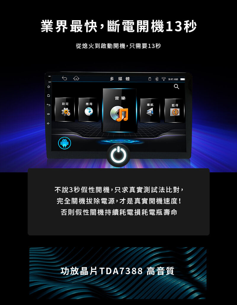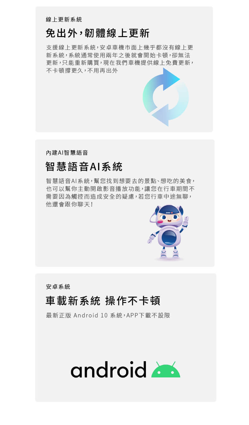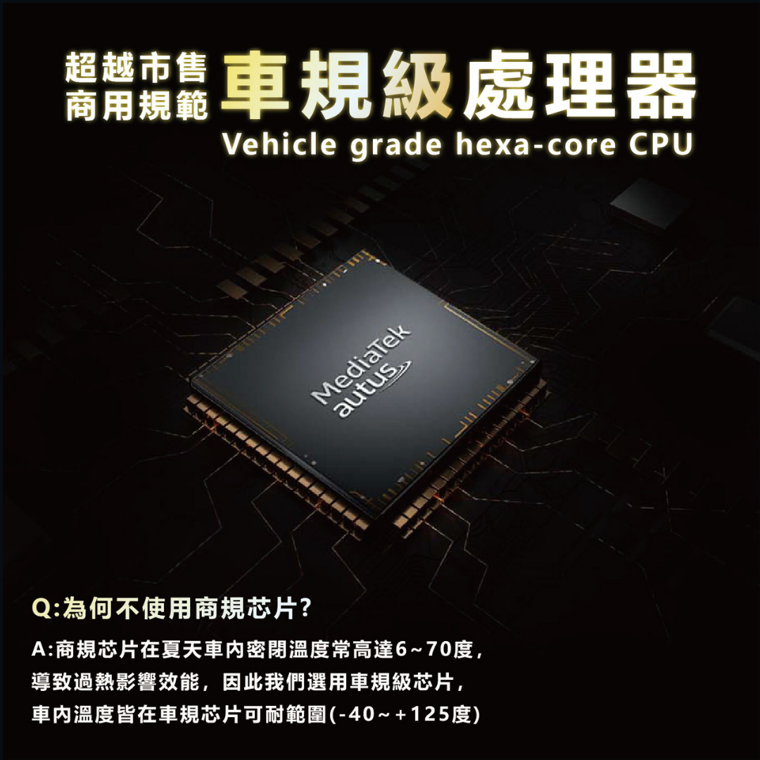 AI 智能車機 | 聲控導航 | 車聯網整合(車框及安裝費用視車型而定,請洽專人諮詢📞 訂購專線:0928-920658) 全新 AI 智能車機,採用正版 Android 系統,結合高效能處理器與 AI 語音控制,帶來智慧、安全、便捷的駕駛體驗。 支援 聲控導航、行車紀錄、環景系統,同時能安裝多款 APP,打造專屬於您的車載智慧娛樂平台。 核心特色 ● 正版 Android 10.0 系統,支援子母畫面 ● QLED 液晶顯示螢幕,色彩鮮明清晰 ● AI 語音聲控:支援自錄語音,可自由更換語音助手 ● 聯發科車規級晶片:聯發科車規級 MT2712Q/COZC 六核心處理晶片 ● 快速開機:業界最快,斷電後 12 秒即可開機 ● 智慧車聯網:支援車載互聯網,APP 安裝、影音娛樂、導航一次搞定 ● 強大影像支援: ○ 6 路 AHD 攝像頭 ○ 支援環景系統 ○ 行車紀錄器最高 4K ○ 後頭枕 / 吸頂螢幕影像輸出 ● 高音質功放晶片:TDA7388,帶來極致音效 ● 多項安全認證: ○ 商檢證號:R51160 RoHS ○ CCAJ21LP0900T6 ○ 投保 3000 萬產品責任險 ________________________________________ 產品規格 系統平台 ● 作業系統:正版 Android 10.0 ● 處理器:聯發科 MT2712Q / COZC 六核心車規級處理器 ● GPU:內建 3D 圖形處理器 記憶體與儲存 ● RAM:4GB LPDDR4 ● ROM:32GB 顯示螢幕 ● 面板:QLED 液晶顯示器 ● 多點觸控電容屏 ● 支援 9 / 10 吋規格 網路與連線 ● WiFi:802.11 a/b/g/n/ac ● 藍牙:5.0 系統 / EDR 3.0,支援電話免持、語音撥號 ● 支援 Google Play 下載與所有車載版 APK 安裝 影音功能 ● 解碼能力:1080P 高畫質解碼 ● AV 影像輸入:1 路 ● AHD 攝像頭輸入:6 路 ● HDMI / 後頭枕 / 吸頂螢幕輸出 導航功能 ● 內建授權導航:PAPAGO 導航 ● 支援 AI 智慧語音聲控導航 行車安全 ● 支援行車紀錄器(最高 4K) ● 相容市售通用環景系統 ● 支援方向盤控制(音量 / 選台) 其他規格 ● 功放晶片:TDA7388 高音質音效 ● 車規溫度範圍:-40°C ~ +125°C ● 支援 FOTA 線上軟體更新(比照 iOS/Android) ● 開機速度:斷電後 12 秒開機 保固與認證 ● 車機保固一年 ● 投保 3000 萬產品責任安全險 ● 商檢證號:R51160 RoHS / CCAJ21LP0900T6 建議售價 $22,988