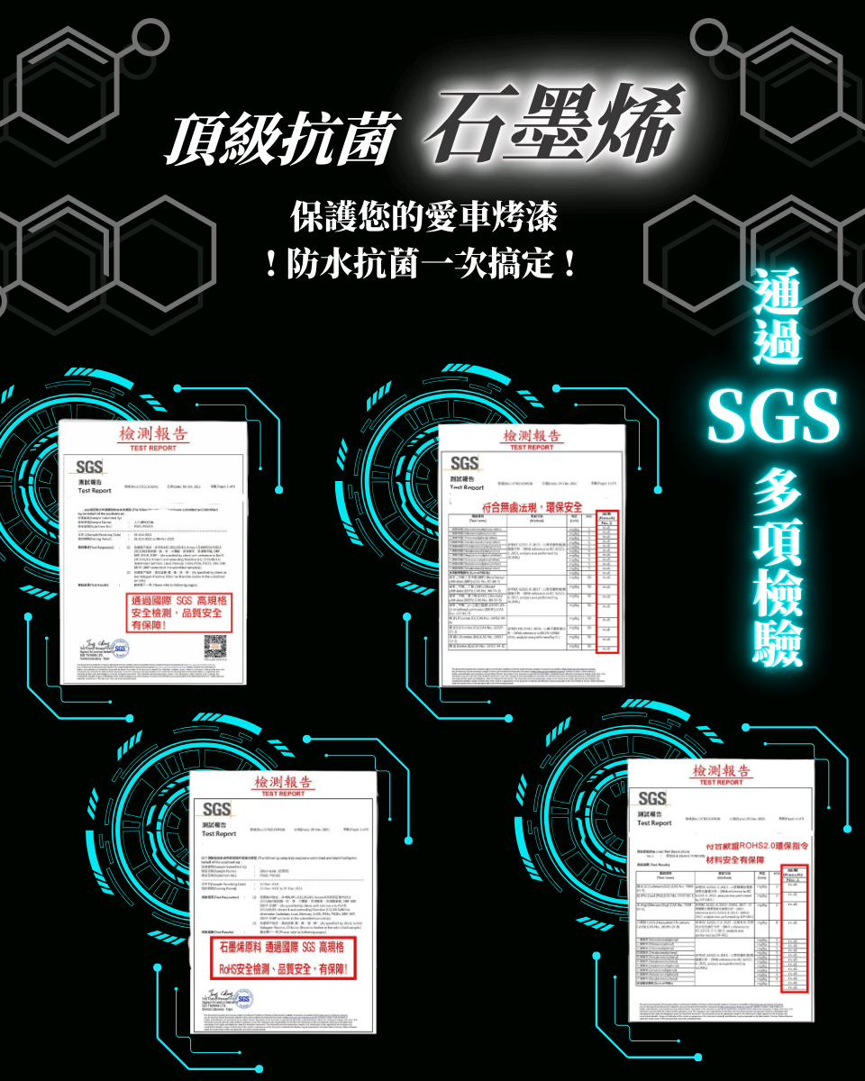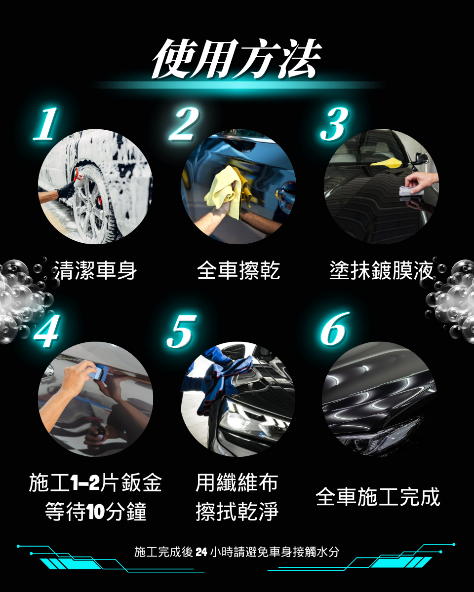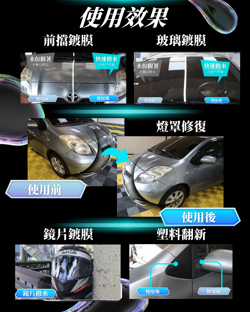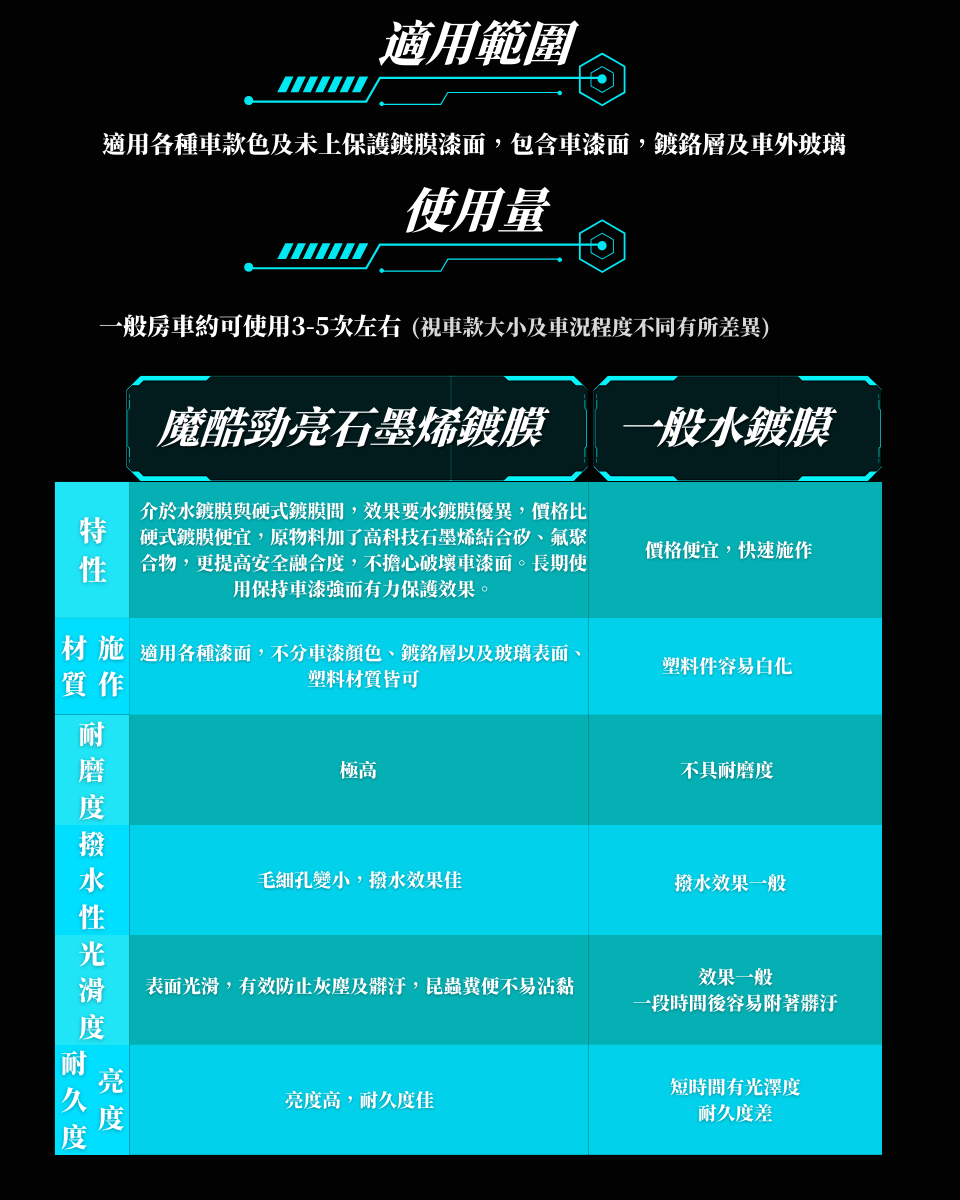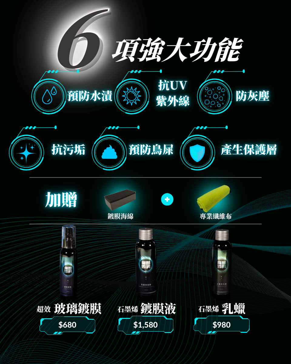 魔酷勁亮超效玻璃鍍膜劑 \產品用途 : 使用特殊氟素成分及配方 , 結合清潔玻璃 , 加 強潑水功能 , 讓行車更加安全 , 視野超清晰日常玻璃清潔 使用 , 維持堆疊鍍膜層 , 潑水性及耐久性更優效防止灰塵 、 油垢附著 產品成分 : 異丙醇 、 氟矽化合物 、 純水 使用方式 : 玻璃清潔後 , 噴於玻璃表面 , 使用超細纖維布 擦拭 , 重複處理清潔油膜 , 再次噴塗 , 等待約 1 5 分鐘 , 待表面乾燥 , 再以超細纖維布重複擦拭至光亮 , 竟至半天 至一天 , 即可碰水 魔酷勁亮石墨烯乳蠟 品用途 : 採用頂級抗菌石墨烯結合矽 、 氟聚合物 , 高抗 UV 、 高防水 、 抗汙垢 , 保護你的愛車烤漆層 , 光滑亮澤 , 適用各種車色即未上鍍膜漆面 , 特定材質 , 包含漆面 , 鍍 鉻層及車外玻璃 產品成分 : 石墨烯 、 聚四氟乙烯 、 陶瓷化合物 、 異丙醇 、 界面活性劑 、 矽聚合物 、 特殊配方 使用方式 : 1.先將車身徹底清潔乾淨 , 並擦乾殘留水滴 2. 手工上蠟或輕壓機器上蠟 , 取適量乳蠟來回輕推並拋光 , 靜待 5 - 10 分鐘 3.下蠟 , 使用專業纖維布 , 將乳蠟徹底推 均勻 , 完成即有明顯之效果 魔酷勁亮石墨烯全方位鍍膜液 產品用途 : 目前最新科技材料添加 , 使得本鍍膜液具有極 佳的亮澤度及保護 , 適用各種漆面 , 不分顏色 , 鍍鉻層及 玻璃表面 。 獨特的防汙性 , 可以讓您輕鬆維護 , 鍍膜會形 成保護層 , 讓您的愛車光澤閃耀 。 鍍膜層不易被雨水沖洗 破壞 , 洗車後立即回復光亮 , 不需額外打蠟 , 隨時噴上一 層 , 保養省時不費力 。 產品成分 : 石墨烯 、 聚四氟乙烯 、 分子矽素 、 純水 使用方式 : 將車身洗淨後 , 擦拭乾淨 , 全車噴上石墨烯鍍 膜液 , 均勻擦拭 , 靜待 5 - 10 分鐘 , 徹底推均勻 , 完成後 即見明顯效果。