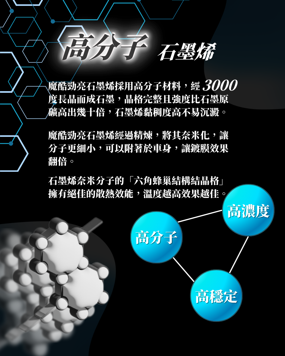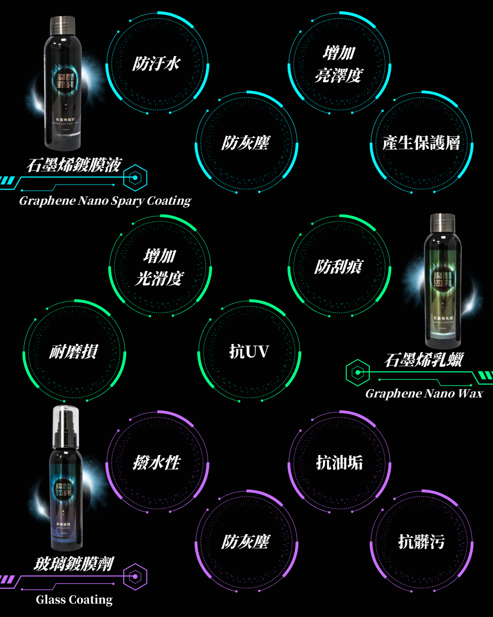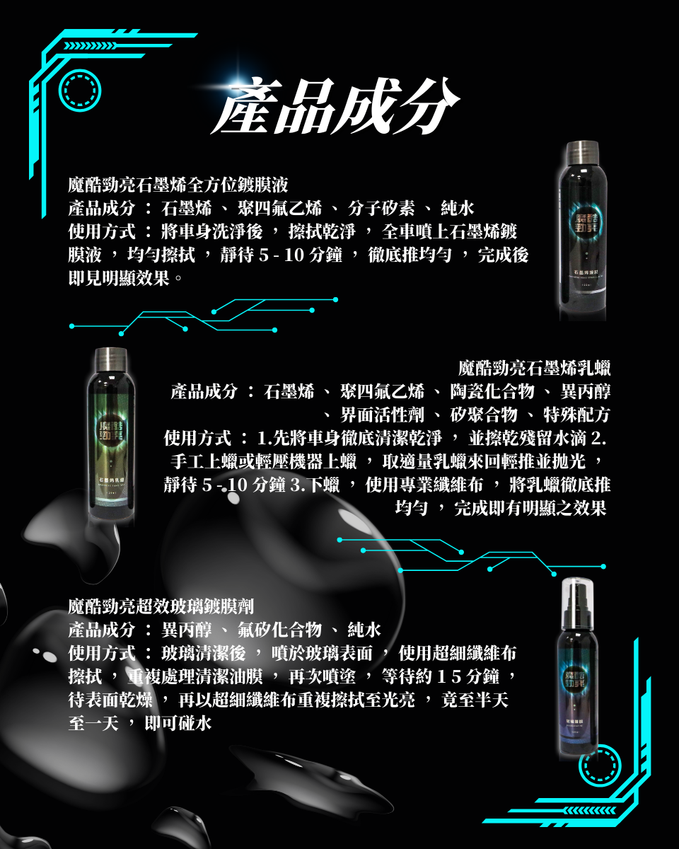 魔酷勁亮超效玻璃鍍膜劑 \產品用途 : 使用特殊氟素成分及配方 , 結合清潔玻璃 , 加 強潑水功能 , 讓行車更加安全 , 視野超清晰日常玻璃清潔 使用 , 維持堆疊鍍膜層 , 潑水性及耐久性更優效防止灰塵 、 油垢附著 產品成分 : 異丙醇 、 氟矽化合物 、 純水 使用方式 : 玻璃清潔後 , 噴於玻璃表面 , 使用超細纖維布 擦拭 , 重複處理清潔油膜 , 再次噴塗 , 等待約 1 5 分鐘 , 待表面乾燥 , 再以超細纖維布重複擦拭至光亮 , 竟至半天 至一天 , 即可碰水 魔酷勁亮石墨烯乳蠟 品用途 : 採用頂級抗菌石墨烯結合矽 、 氟聚合物 , 高抗 UV 、 高防水 、 抗汙垢 , 保護你的愛車烤漆層 , 光滑亮澤 , 適用各種車色即未上鍍膜漆面 , 特定材質 , 包含漆面 , 鍍 鉻層及車外玻璃 產品成分 : 石墨烯 、 聚四氟乙烯 、 陶瓷化合物 、 異丙醇 、 界面活性劑 、 矽聚合物 、 特殊配方 使用方式 : 1.先將車身徹底清潔乾淨 , 並擦乾殘留水滴 2. 手工上蠟或輕壓機器上蠟 , 取適量乳蠟來回輕推並拋光 , 靜待 5 - 10 分鐘 3.下蠟 , 使用專業纖維布 , 將乳蠟徹底推 均勻 , 完成即有明顯之效果 魔酷勁亮石墨烯全方位鍍膜液 產品用途 : 目前最新科技材料添加 , 使得本鍍膜液具有極 佳的亮澤度及保護 , 適用各種漆面 , 不分顏色 , 鍍鉻層及 玻璃表面 。 獨特的防汙性 , 可以讓您輕鬆維護 , 鍍膜會形 成保護層 , 讓您的愛車光澤閃耀 。 鍍膜層不易被雨水沖洗 破壞 , 洗車後立即回復光亮 , 不需額外打蠟 , 隨時噴上一 層 , 保養省時不費力 。 產品成分 : 石墨烯 、 聚四氟乙烯 、 分子矽素 、 純水 使用方式 : 將車身洗淨後 , 擦拭乾淨 , 全車噴上石墨烯鍍 膜液 , 均勻擦拭 , 靜待 5 - 10 分鐘 , 徹底推均勻 , 完成後 即見明顯效果。